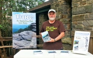 Last Saturday, I went to Mountain Crossings at Neels Gap to sell and sign THRU: An Appalachian Trail Love Story. I was invited by Georganna (people just call her George) and Logan Morton, the new operators of the store. They were having a special day which featured my old friends, the Barker Brothers, a family bluegrass band who add fun to any occasion. There was also a pottery demonstration that looked great. I met Robert Sutherland who runs an AT web page known as AppalachianTrail.com which I highly recommend. He ran the attached photo of me hawking my book and referred to me as the “incredibly handsome” author. I think the portrayal was tongue in cheek seeing as how Robert and I are both men of a certain age, generously proportioned and bearded. But, what the heck, I still sold a bunch of books and made some good friends. Mountain Crossings is located smack dab on the AT. It is the only spot on the entire trail where the footpath goes under a roof. To go through the gap, you must pass under a breezeway. The old CCC-built building where Mountain Crossings is housed is known as the Walisiyi Inn. Walisiyi, as I understand it, is a native American term for “the place of the Big Frog.” There is a Big Frog Wilderness just over the Georgia/Tennessee line in Northwest Georgia. Makes you wonder if prehistoric frogs were the size of dinosaurs. Regardless, I had fun with George and Logan and recommend their fantastic store as a great place to get expert backpacking advice, all kinds of nice crafts and my book!  Stay vertical, you guys, and keep walking.